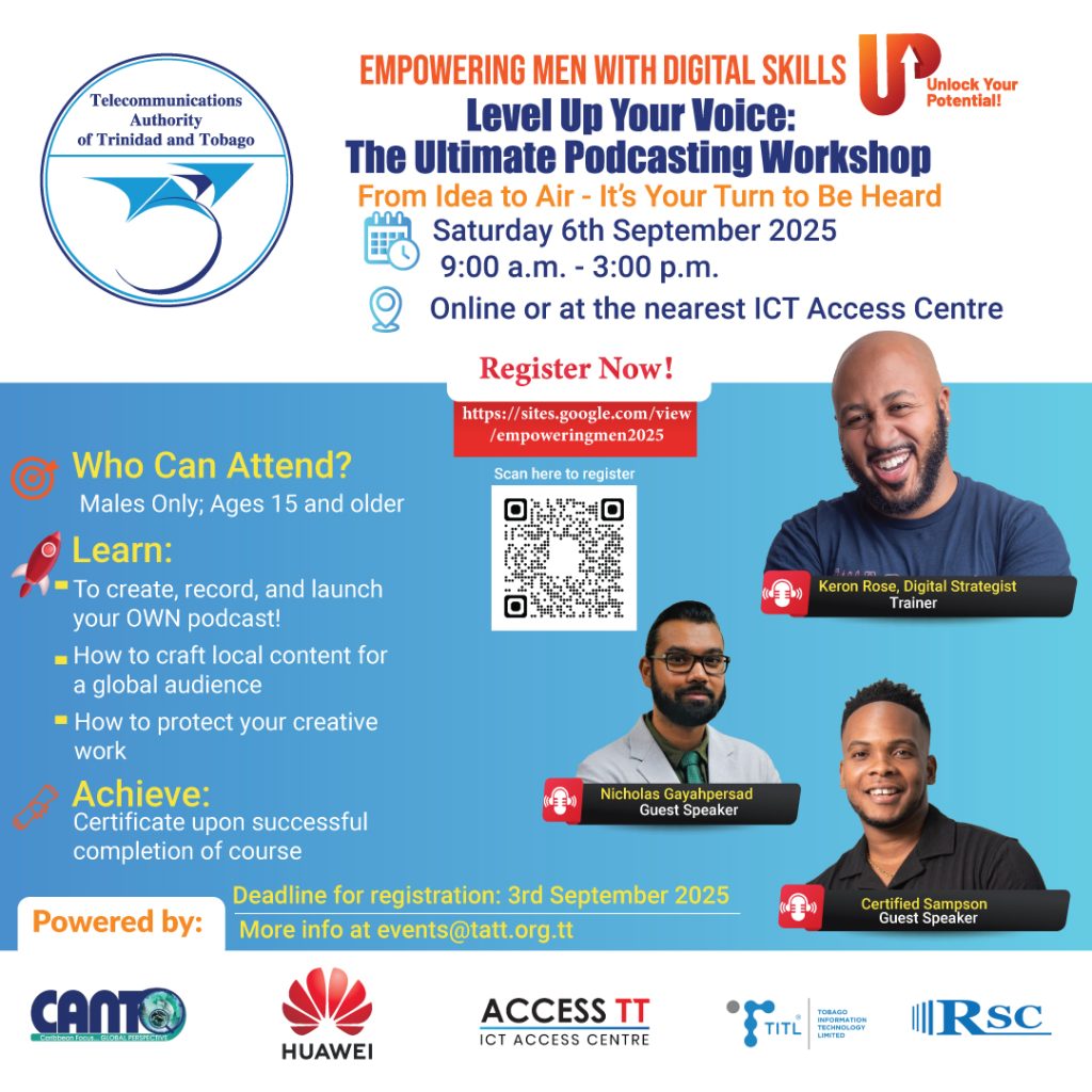 The Telecommunications Authority of Trinidad and Tobago (TATT) will host its annual Empowering Men with Digital Skills Workshop on Saturday, 6th September 2025, under the theme “Level Up Your Voice: The Ultimate Podcasting Workshop”.