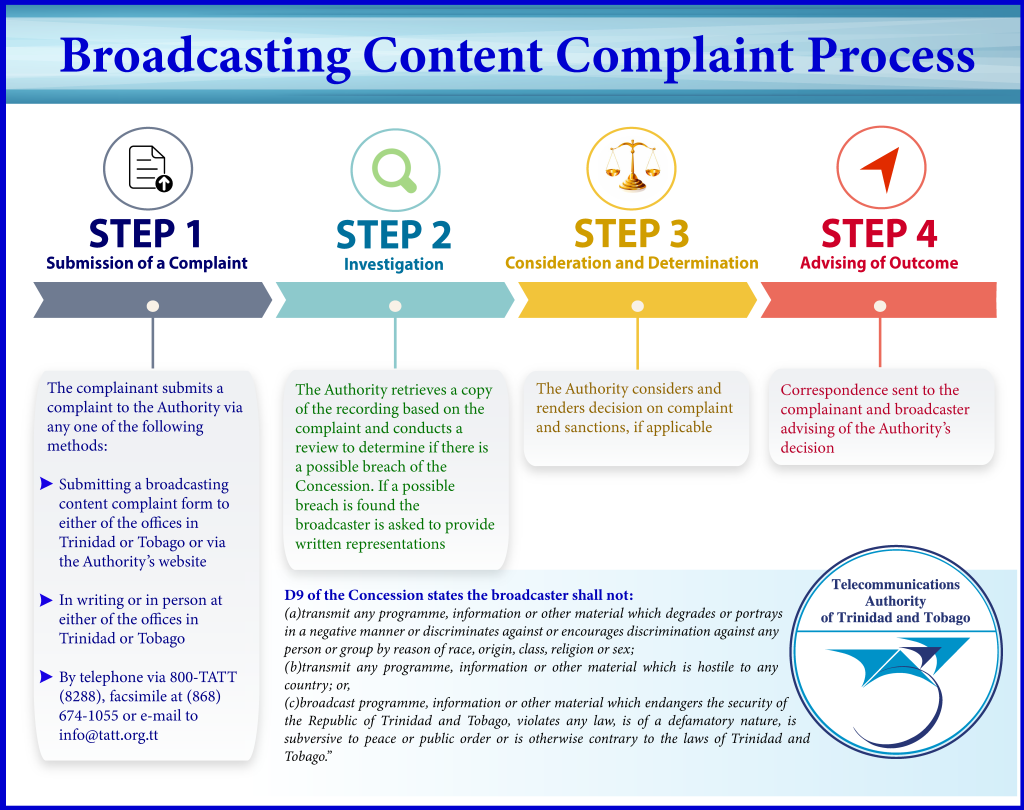 By submission of a Broadcasting Content Complaint Form or letter via hand or post to the Telecommunications Authority of Trinidad and Tobago, #5 Eighth Avenue Extension, Off Twelfth Street, Barataria, Trinidad and Tobago.